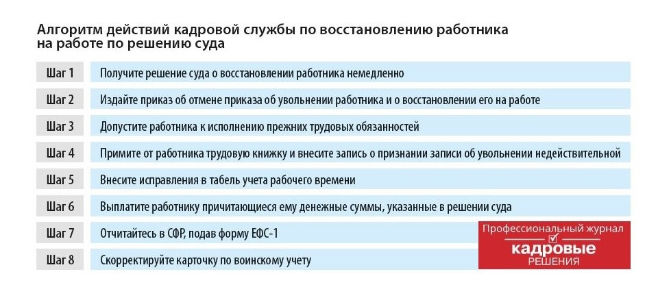 Алгоритм действий кадровой службы по восстановлению работника на работе по решению суда