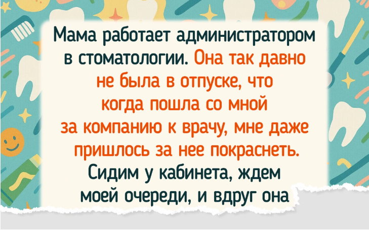 - Мама работает в стоматологии администратором. Она так давно не была в отпуске, что, когда пошла со мной за компанию к врачу, мне даже пришлось краснеть за нее. Сидим у кабинета, ждем моей очереди, а она то на автомате начинает здороваться и прощаться с пациентами, которые проходили мимо.
