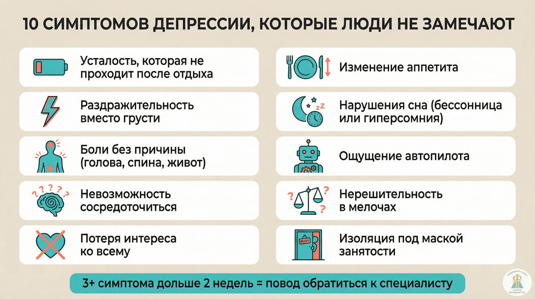 Не узнают. Депрессия ассоциируется с «лежать и плакать». Если человек работает и выполняет обязанности — он исключает депрессию из списка. А зря: высокофункциональная депрессия (когда снаружи всё нормально, а внутри — пустота) встречается чаще, чем принято думать.