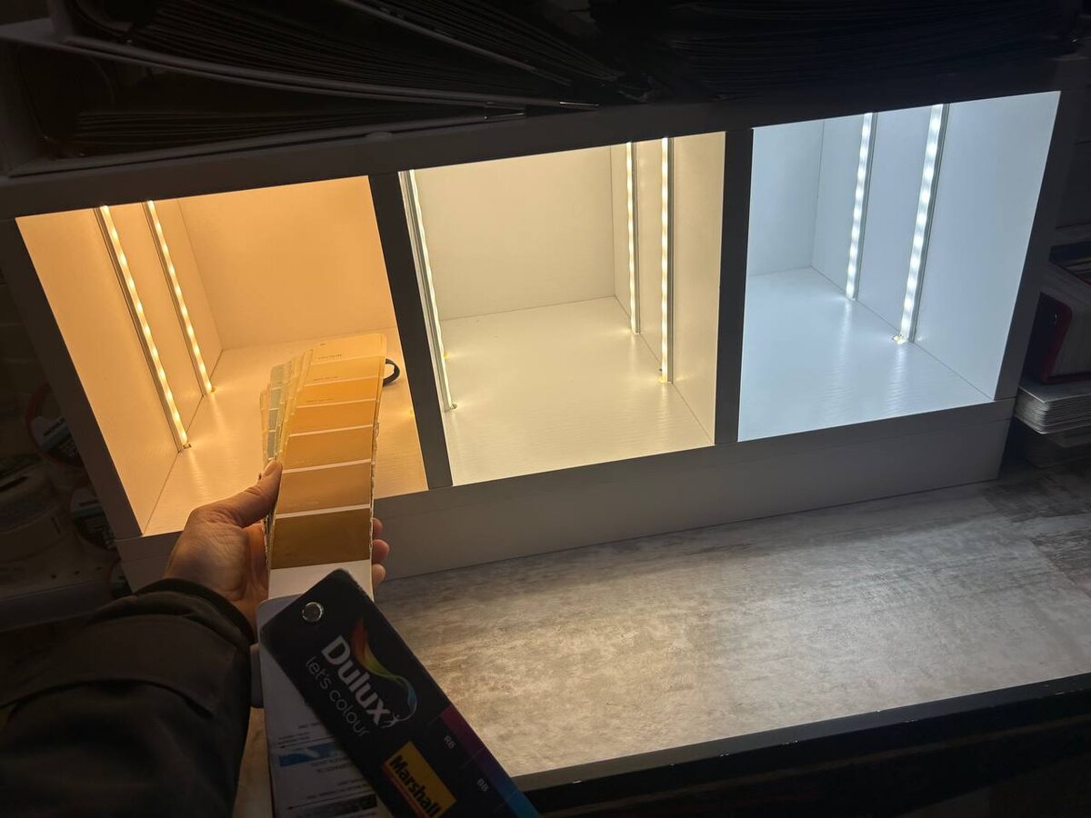Друзья, всем привет! У меня продолжается ремонт в квартире, но мы умудрились уже туда заехать:) Хотела вам подсказать, что если вы выбираете краску вы можете ее проверить в разном свете: дневном, холодном и теплом для этого в Леруа есть такие 3 ящика:) Конечно, все учесть невозможно. Если у вас первый этаж и например, зелень в окне, она тоже даст свой цвет. Но это маленькое подспорье в выборе краски 🎨 , надеюсь вам пригодится!