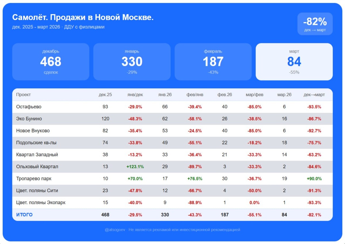 📉 Не буду перечислять все беды пикирующего застройщика SMLT. Но как на негатив реагируют покупатели? ✅ Аналитики @atsogoev собрали данные по продажам «Самолёта» в важной для девелопера локации, Новой Москве, за четыре месяца подряд - с декабря 2025 по март 2026. И таки что вы думаете? 📊 В пиковом декабре по 9 проектам застройщика было зарегистрировано 468 сделок. В январе - 330 (-29%). В феврале - 187 (-43%). В марте - 84 (-55%). Итого за четыре месяца минус потерял 82% объёма продаж в локации. 🔻 Отдельные проекты падают совсем жёстко. «Остафьево» - с 93 сделок в декабре до 6 в марте (-93,5%). «Новое Внуково» - с 82 до 6 (-92,7%). «Цветочные поляны Экопарк» - с 15 до 1 (-93,3%). Единственное исключение - «Тропарево парк», который вырос с 10 до 19 сделок (+9 сдлелок!) 🏗 А может это всё на фоне очередного последнего вагона (ужесточения семейки)?Рынок Новой Москвы действительно просел по продажам процентов на 30, но он вполне бодр, просто покупатели голосуют не в пользу «Самолёта»