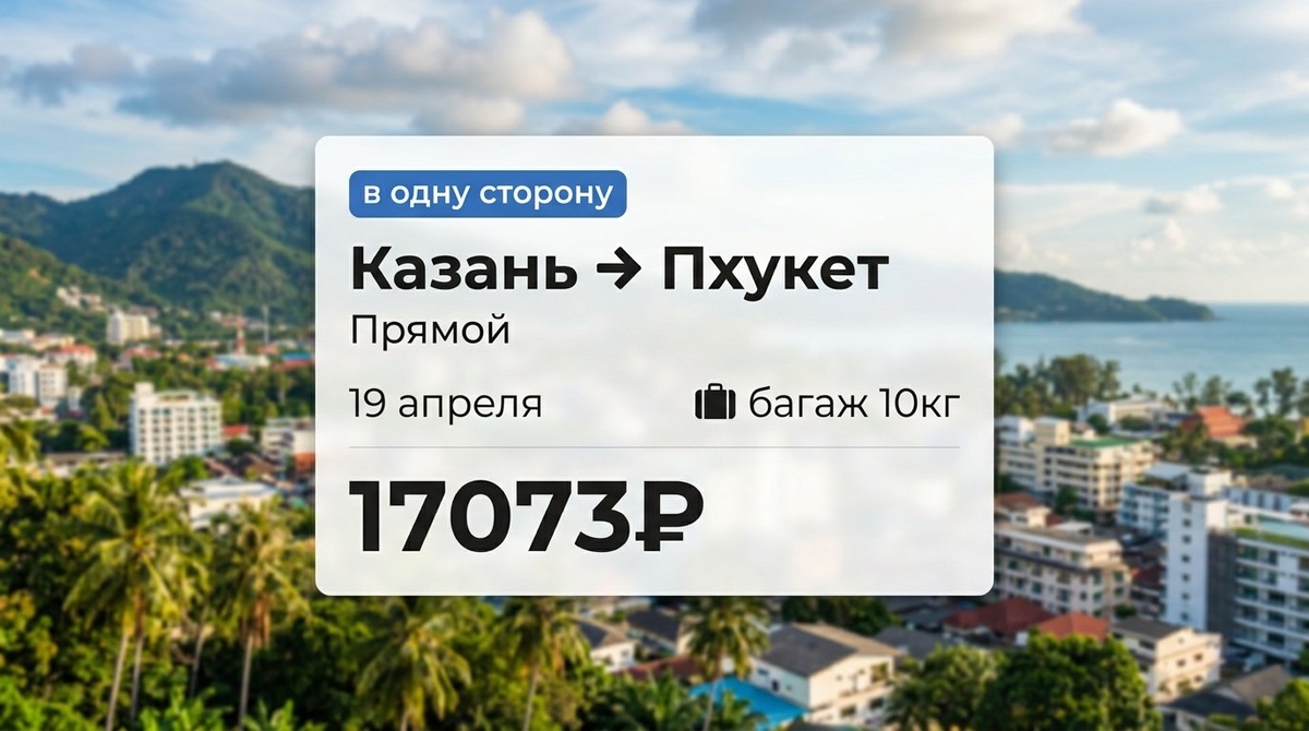 ! • Казань — Пхукет 19 апреля за 17 073₽ (багаж 10 кг включен) • Екатеринбург — Пхукет 17 апреля за 17 073₽ (багаж 10 кг включен) • Казань — Фукуок 16 апреля за 21 342₽ (багаж 10 кг включен) Места по таким тарифам разлетаются мгновенно, поэтому бронируйте билеты сразу!