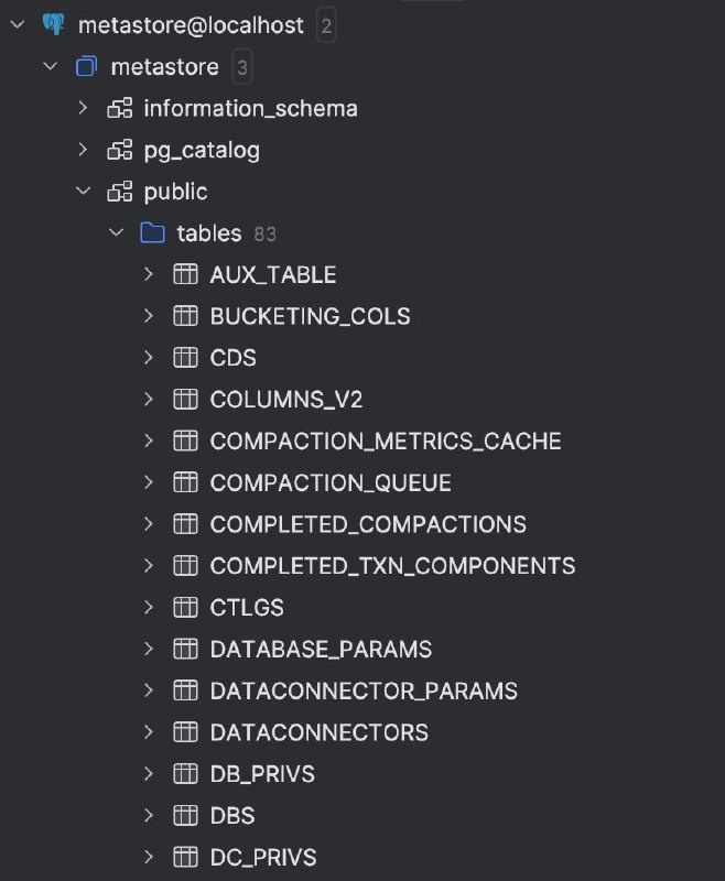 Вы когда-нибудь заглядывали, что на самом деле хранится в базенке хайв метастора? Там создаются системные таблицы с инфой по базам, таблицам, путям, колонкам и еще много всего Из наиболее полезных таблиц я для себя выделила: 🤩COLUMNS_v2 - о колонках 🤩CTLGS - о каталогах 🤩DBS - о схемах 🤩ROLES - о ролях 🤩SDS (Storage Descriptors) - о путях к таблицам 🤩TABLE_PARAMS - о свойствах таблиц 🤩TBLS - о таблицах И на основе этого мы можем вывести сводную инфу по всем схемам, таблицам, полям: SELECT d."NAME", t."TBL_NAME", t."OWNER", s."LOCATION", c."COLUMN_NAME", c."TYPE_NAME", c."COMMENT" FROM "TBLS" as t JOIN "DBS" d ON t."DB_ID" = d."DB_ID" JOIN "SDS" s ON t."SD_ID" = s."SD_ID" JOIN "COLUMNS_V2" c ON s."CD_ID" = c."CD_ID" --WHERE d."NAME" = 'raw' --AND t."TBL_NAME" = 'test' ORDER BY d."NAME", t."TBL_NAME", c."INTEGER_IDX"; А на этой картинке представлена ER-диаграмма модели данных @data_engineerette