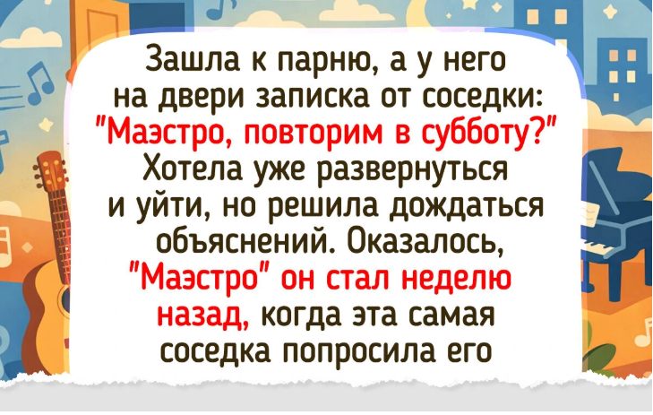 - Зашла к парню, а у него на двери записка от соседки: «Маэстро, повторим в субботу?» Хотела уже развернуться и уйти, но решила дождаться объяснений. Оказалось, «Маэстро» он стал неделю назад, когда эта самая соседка попросила его помочь разделать огромную щуку, которую ей прислали из деревни. Парень так увлекся процессом и так профессионально размахивал ножом, что та в восторге прозвала его «Маэстро разделки».
