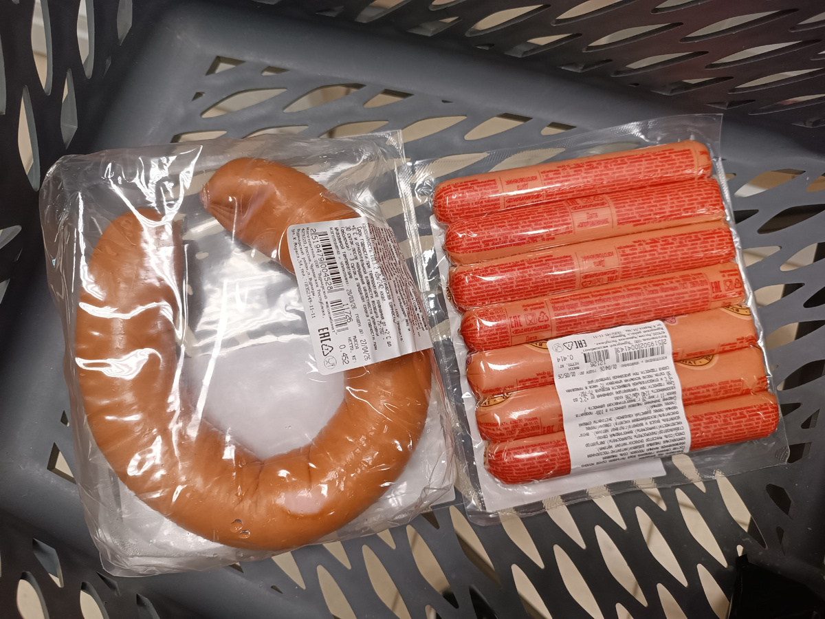 Пошла в Пятерочку посмотреть - есть ли там что-то, что хоть есть можно без риска для ЖКТ... И начала изучать этикетки. Недолго изучала, первые посмотрела и взяла в руки как раз те, которые покупатели брали передо мной. Оказалось, что на этикетке нет надписи в составе о наличии мяса механической обвалки. Надо брать!