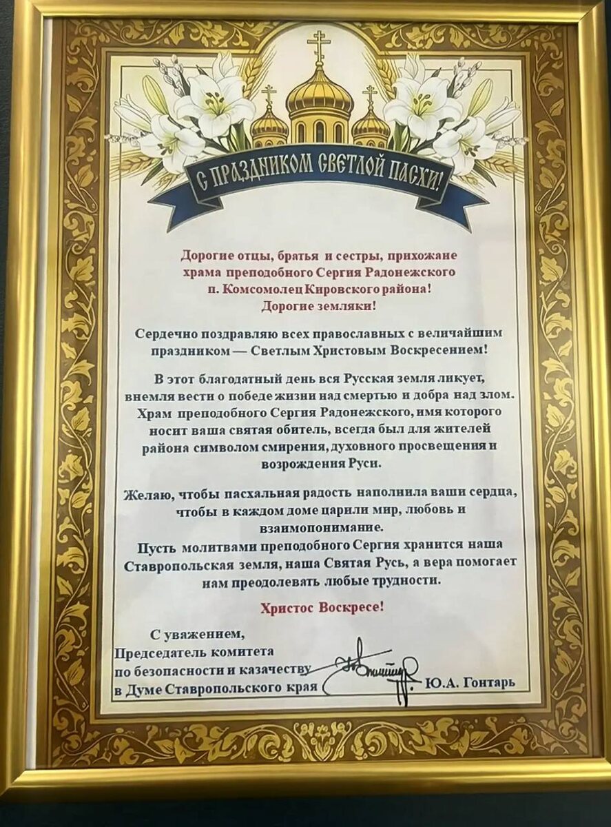 Председатель комитета по безопасности и казачеству в Думе Ставропольского края Гонтарь Юрий Афанасьевич поздравляет жителей Кировского округа и всех православных с величайшим праздником: Светлым Христовым Воскресением!