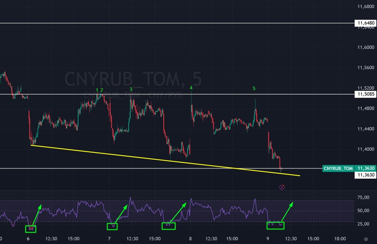 🟢 В юане все еще нет отскока. На часовике конвергенция сломалась. Есть еще конвергенция на 4-х часах, но она там будет "высосана из пальца". Сейчас цена пришла на поддержку 11,36. если и от нее не будет видно никакой бычьей реакции, то, наверное, отскока не будет. 🟢 В 11,50 было 5 ударов, что говорило о возможном прорыве вверх. В данной проторговке каждый раз при часовой перепроданности был отскок. Посмотрим, что будет к вечеру. 🚗 Аргументы за отскок есть, но пока что у рынка свои планы. Пока еще шансы на отскок вверх есть, но стратегически жду валюту на перелой года. #юаньрубль #юань #прогнозрубля #рубльдоллар #cnyrub #cnyrubf #bogdanoffinvest $CRM6 $CRU6 $CNYRUB $CNYRUBF