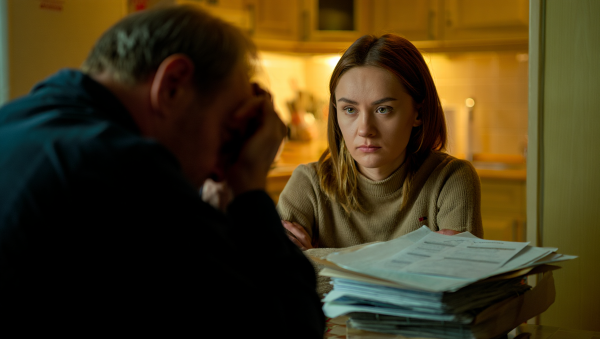 Сергей вошёл в кухню, увидел стопку и сразу всё понял. Лицо его обмякло. Он опустился на табуретку напротив жены, не снимая куртки.