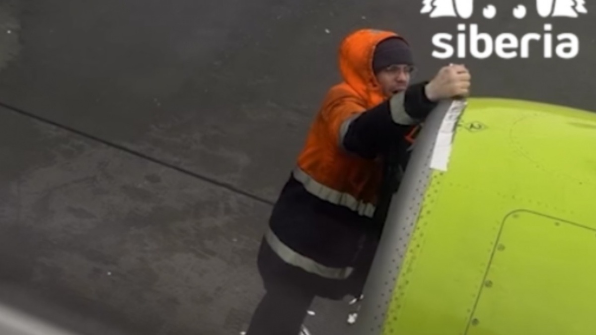 В Толмачёво рабочий заклеил двигатель самолёта S7 скотчем перед вылетом