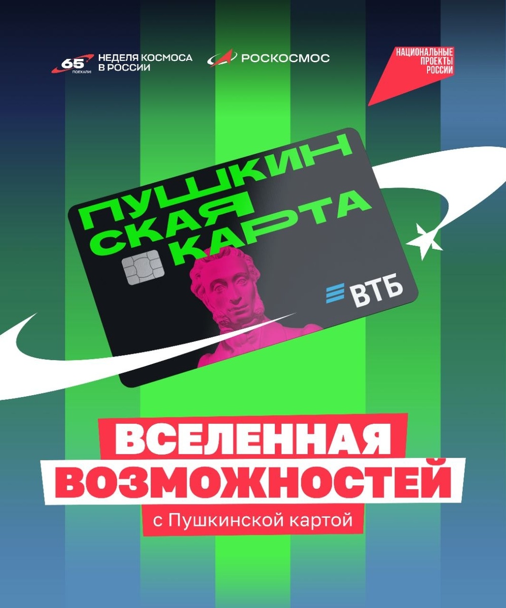 🚀 Главное — не забудьте Пушкинскую карту! По нацпроекту «Семья» получить её могут молодые люди от 14 до 22 лет. Каждый год — 5 000 рублей на выставки, спектакли и другие культурные мероприятия. И до 2 000 рублей — на билеты в кино. 🪐 С ней вы узнаете тайны планет и галактик в музеях, посмотрите фильм о путешествиях во времени или послушаете историю о первых полётах на аудиоспектакле. А отличный повод для этого — Неделя космоса. Собрали в карточках подборку — поделитесь ей с друзьями и близкими! #нацпроектсемья #пушкинскаякарта #неделякосмоса ⚡️ Подписывайтесь на канал Национальных проектов | Читайте нас в MAX