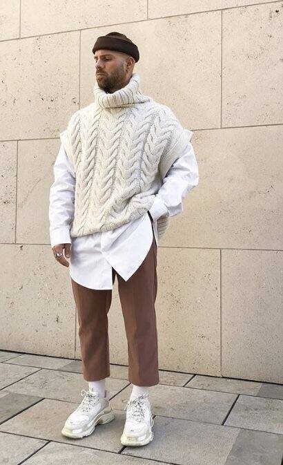 Минимализм, который выглядит дорого. 🤍Основа — белая рубашка и укороченные брюки. Поверх — объёмный жилет с фактурой: именно он делает образ интересным, а не «пустым». 🤍Цвета спокойные: молочный + коричневый. За счёт этого образ выглядит собранно и легко. 🤍Кроссовки и шапка добавляют расслабленности — нет ощущения «слишком нарядно». Почему работает: — чистая база — акцент на фактуре — спокойная палитра — баланс классики и casual Жилет Рубашка Брюки Обувь Головной убор