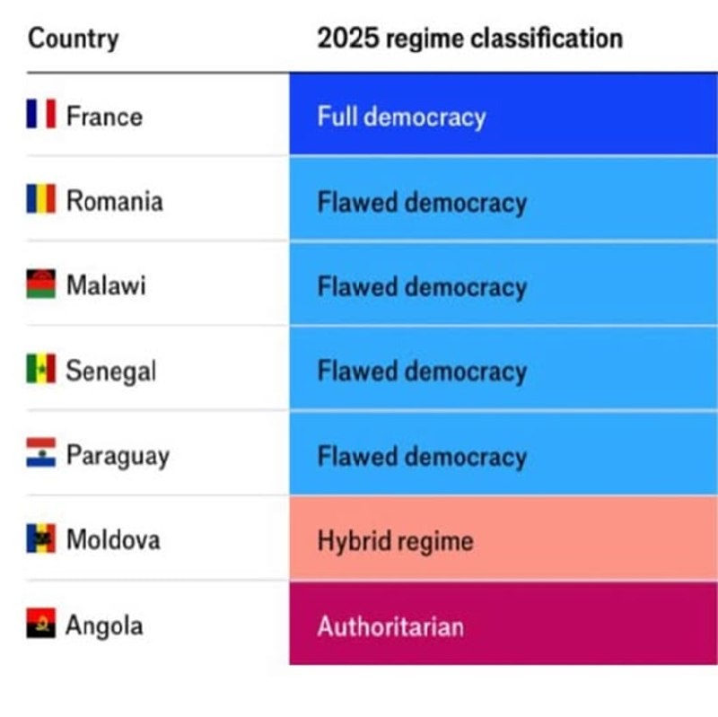 ». Стало еще хуже По версии Economist Intelligence Unit, страна в 2025 году опустилась из категории «дефектная демократия» в категорию «гибридных режимов» – это уже смесь демократии и авторитарных практик. Такой статус обычно означает проблемы с институтами, давлением на систему и снижением политического плюрализма. Проще говоря – формально демократия есть, но работает она с перебоями (мягко говоря). 🙄Это не просто рейтинг. Это сигнал о том, как страну видят снаружи – и насколько устойчивой считается её политическая система. @eNewsmd.online