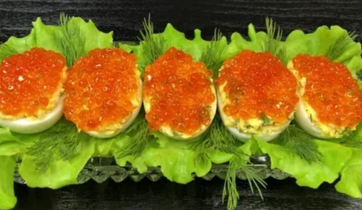 - верху на каждое яйцо выложить по 1 ч. л. красной икры.