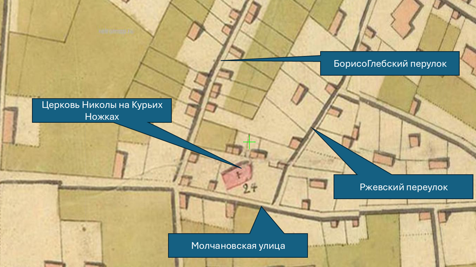 Не далеко от Поварской, между Ржевским и БорисоГлебским переулками при их впадении в Большую Молчановку стояла церковь. Не далеко от Поварской, между Ржевским и БорисоГлебским переулками при их впадении в Большую Молчановку стояла церковь. Вот она на карте 1810 года. Как видите рядом с ней несколько домов, это важно, запомните их. Да-да, церковь на Курьих ножках была в Москве. Да что там была, её как всегда сделал бессмертным АС Пушкин. В 1810 году Сергей Львович и Надежда Осиповна Пушкины снимали на углу Большой Молчановки и Борисоглебского небольшой деревянный домик, принадлежавший Василию Иванову – священнику церкви Николая Чудотворца на Курьих Ножках. В метрических книгах этой церкви были сделаны в сентябре и в декабре 1810 года записи о смерти младшей сестры Александра Пушкина Софии, прожившей год и восемь месяцев, и пятимесячного брата Павла. Принято считать, что именно из этого дома будущий «наше все» уехал в Санкт-Петербург поступать в лицей. Это карта 1850 года, на ней видно