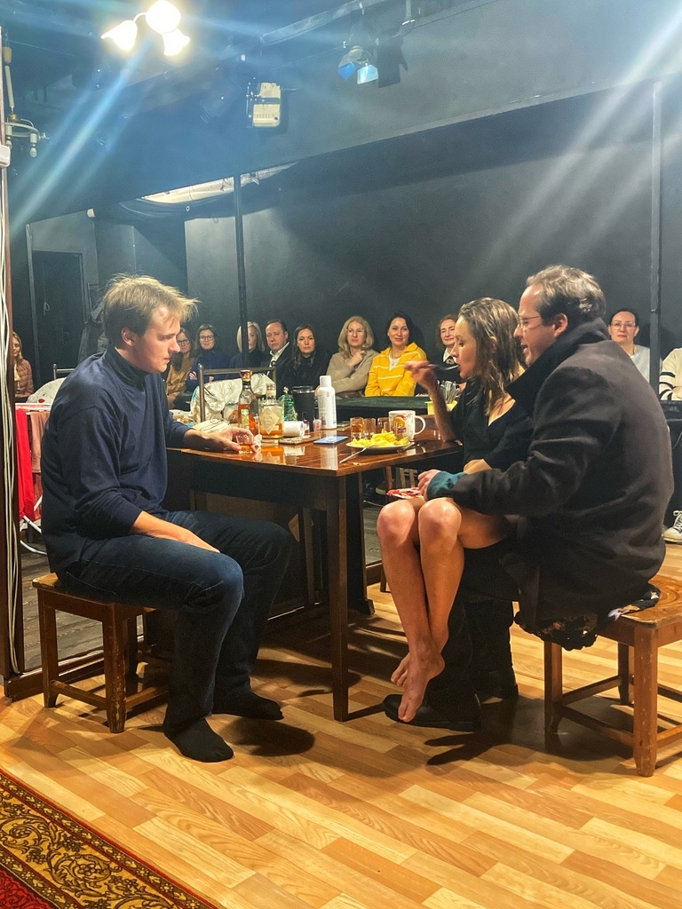 «Три» – страницы в дневнике нашего поколения о времени пандемии. «Три» – постмодернистское произведение, переносящее Чеховские образы в современный Петербург. «Три» – почти иммерсивный спектакль с максимальным эффектом присутствия, реалити-шоу об обычных нас, с обычными отвратительными травмами, прекрасными чувствами, честными слезами. Неудобное камерное пространство театра Малыщицкого использовано по максимуму. Замкнутость, нехватка места и теснота становятся достоинствами сцены, превращенной в трёхкомнатную коммунальную квартиру. Зрители словно сидят с актерами за одним кухонным столом, подглядывают за происходящим из-за кровати и комода. В какой-то момент хочется даже протянуть руку и попросить посмотреть книгу, которую обсуждают герои. Этот спектакль – явление в театральной жизни Петербурга. Счастье, что у нас есть возможность ходить на такие постановки. Первый акт «Трёх» – великолепный современный театр, от которого не оторваться, один из лучших, что мы видели за последнее время.