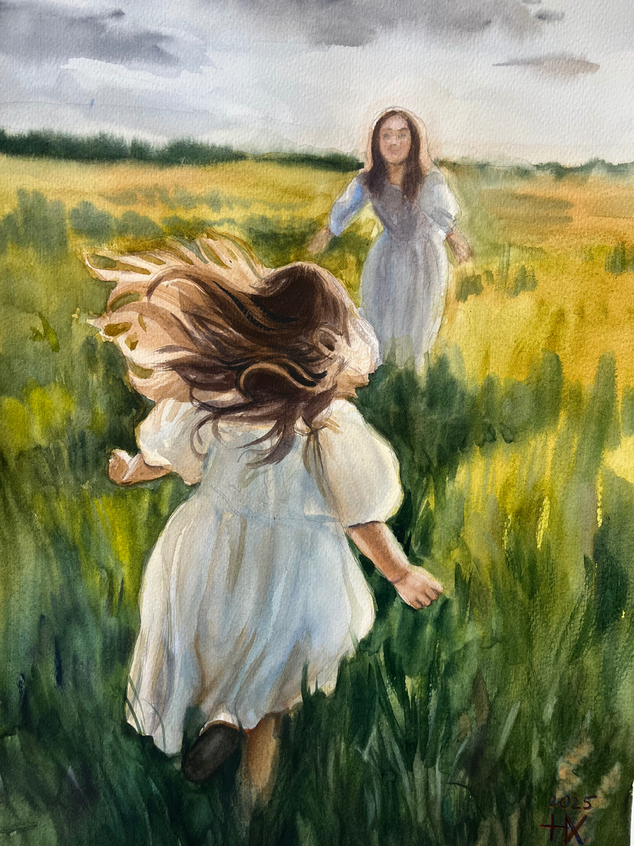 Картина встреча. 🫂! Она написана акварелью на бумаге. Размер картины 30/40 см. Картина в раме со стеклом. На картине изображены две девочки, бегущие по полю. Одна девочка находится ближе к зрителю, её волосы развеваются на ветру, создавая ощущение движения. Она одета в светлое платье, которое тоже колышется от ветра. Вторая девочка видна чуть дальше, она смотрит вперёд и улыбается, словно зовёт