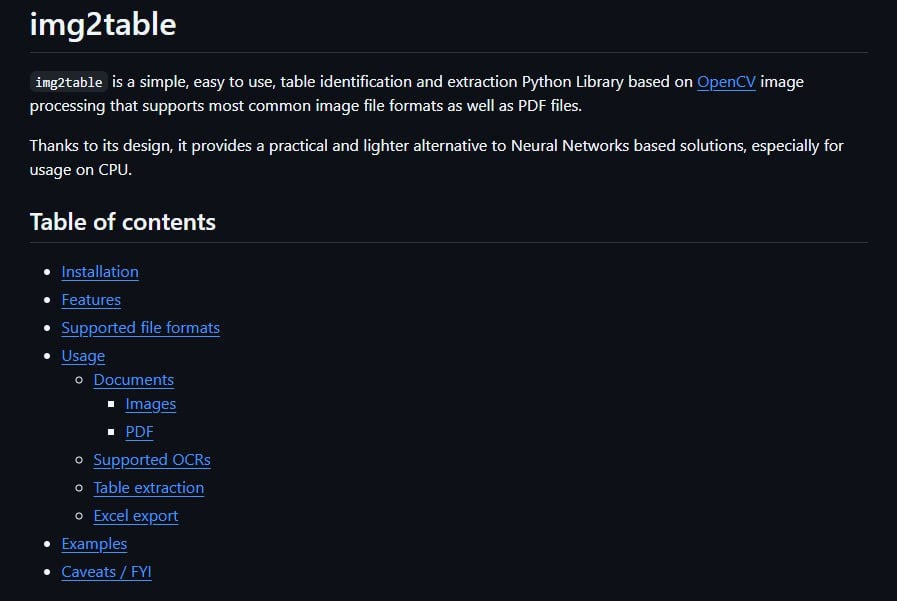 🚀 img2table — это Python-библиотека для извлечения таблиц из изображений и PDF-файлов с последующим преобразованием их в структурированные данные (например, pandas DataFrame или Excel). 📌 Основные особенности: 🔵Извлечение таблиц из изображений (PNG, JPG и др.) 🔵Поддержка работы с PDF-документами 🔵Автоматическое обнаружение структуры таблиц (строки, столбцы и ячейки) 🔵Поддержка OCR для распознавания текста в таблицах 🔵Интеграция с Tesseract, EasyOCR, PaddleOCR, AWS Textract и Google Vision 🔵Преобразование таблиц в pandas.DataFrame 🔵Экспорт извлечённых таблиц в Excel 🔵Гибкая настройка параметров извлечения таблиц 🔵Быстрое извлечение таблиц с использованием алгоритмов компьютерного зрения ➡️Установка библиотеки: pip install img2table 📱 Репозиторий ➡️Справочник Программиста. Подписаться