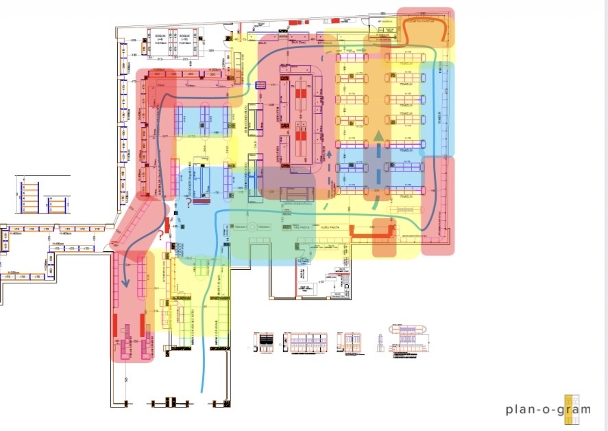 Каждый квадратный метр магазина — это либо актив, либо пассив. Вы платите аренду за весь объём, но деньги приносят только 30% площади. Остальное как болото, трясина и вечная мерзлота. Важно нанести на карту\ схему зоны температуры и перекроить пространство так, чтобы клиент сам шёл туда, куда нужно вам. Можно разделить магазин на три типа территорий: 1. Красный пояс (зона импульса и денег) — туда взгляд падает первым, ноги идут на автопилоте. Здесь нужны товары с высокой маржой. 2. Жёлтая зона (транзит) — люди проходят, но не останавливаются. Здесь нужны якоря, чтобы их затормозить. 3. Синий ледник (мёртвая зона) — туда не заходят, там пылятся остатки. Здесь либо склад, либо мощный активатор. Зонирование помещения магазина Входя, человек бессознательно выбирает маршрут. Тепловая карта шагов за 3 дня покажет чёткие тропы. Горячие зоны. Вход + 1–2 метра — «порог адаптации». Глаз привыкает к свету, но товар здесь не покупают. Не ставьте сюда дорогую новинку, так как её не заметят. Правая
