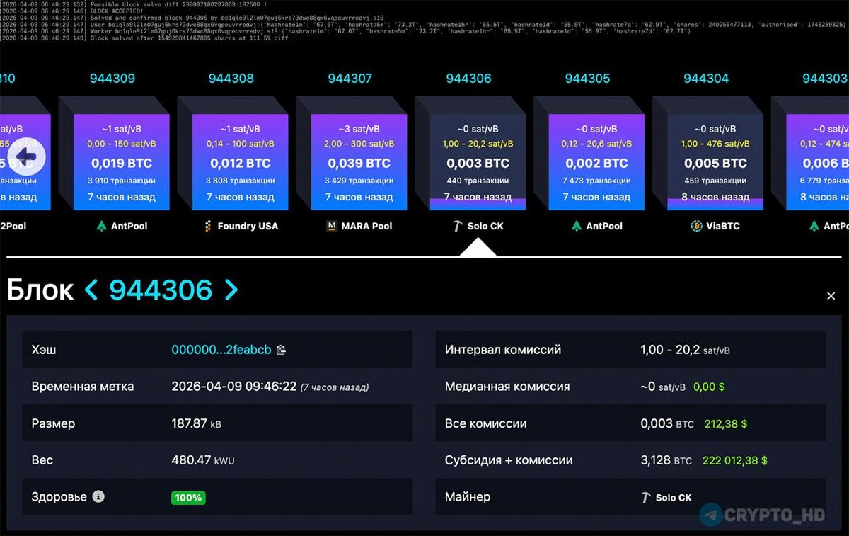 🤯 Майнер-одиночка с мощностью всего ~70 TH/s добыл блок Биткоина и заработал 3,13 BTC (~$222k