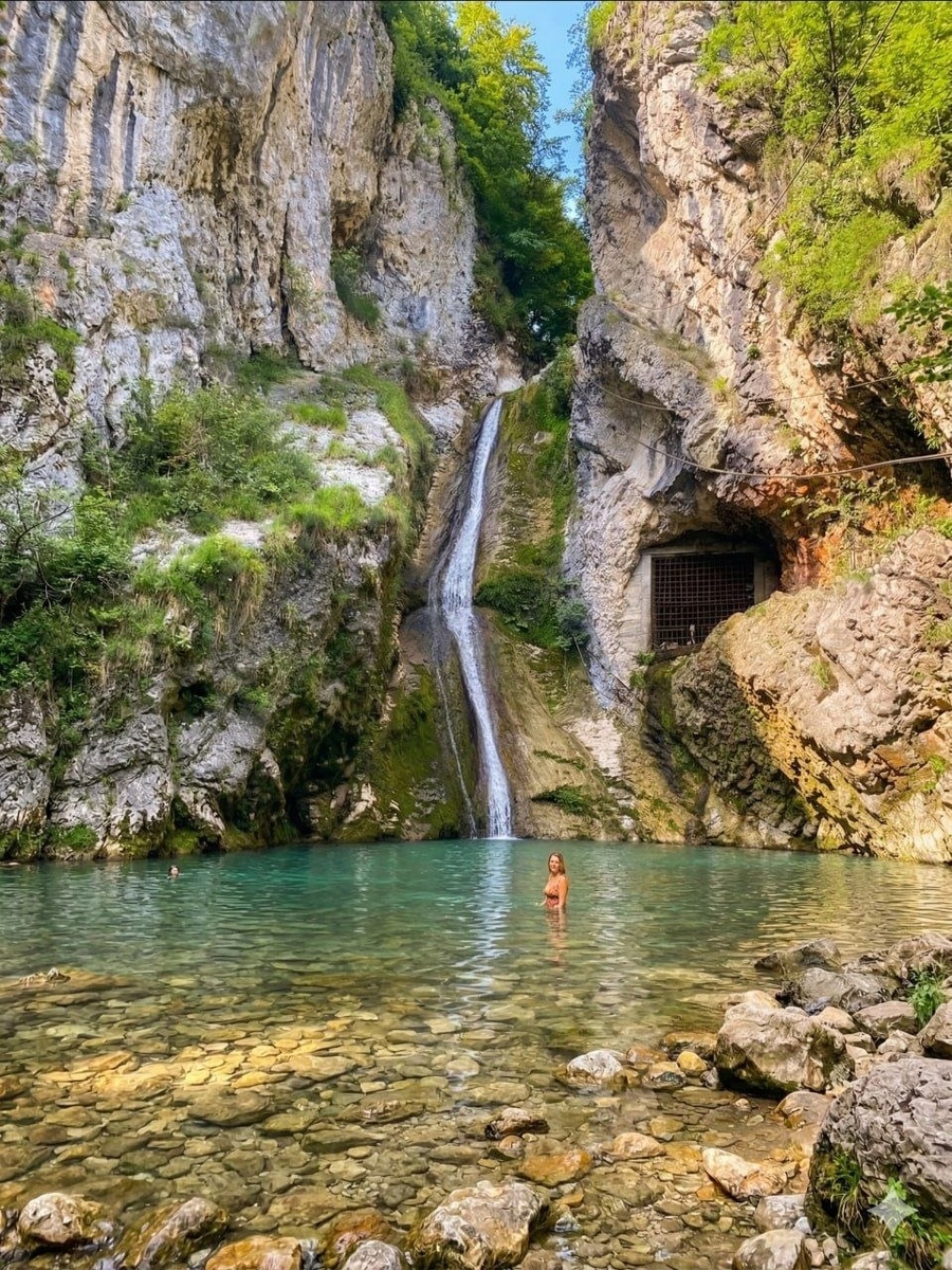 ?😳 Название уже странное. Но еще страннее - расположенная там пещера с летучими мышами. Мсракуара - это река в городской черте Новго Афона. Переводится слово как “Египетская река”. Почему так - до конца никто не знает🫣 Река в одном месте обрывается вниз и образует водопад. Под ним собирается небольшое озеро. В ясную погоду вода там голубая и очень прозрачная. Место тихое, людей почти нет. Кто знает - приходит купаться в чистейшей водичке. Но дальше начинается еще интереснее. Рядом с водопадом есть тоннель. И он выглядит так, будто его сделали люди. Не просто скала и не трещина, а именно проход. С одной стороны он закрыт решёткой. С другой - уходит в пещеру. И внутри уже совсем другая атмосфера. Прохладно, темно, и на потолке висят летучие мыши 😯 Позже мы узнали, что рядом проходит железнодорожный тоннель, и часть этих проходов может быть технической. Но ощущение от этого не становится менее странным. Такие места в Абхазии цепляют сильнее всего. Они оставляют ощущение, что ты
