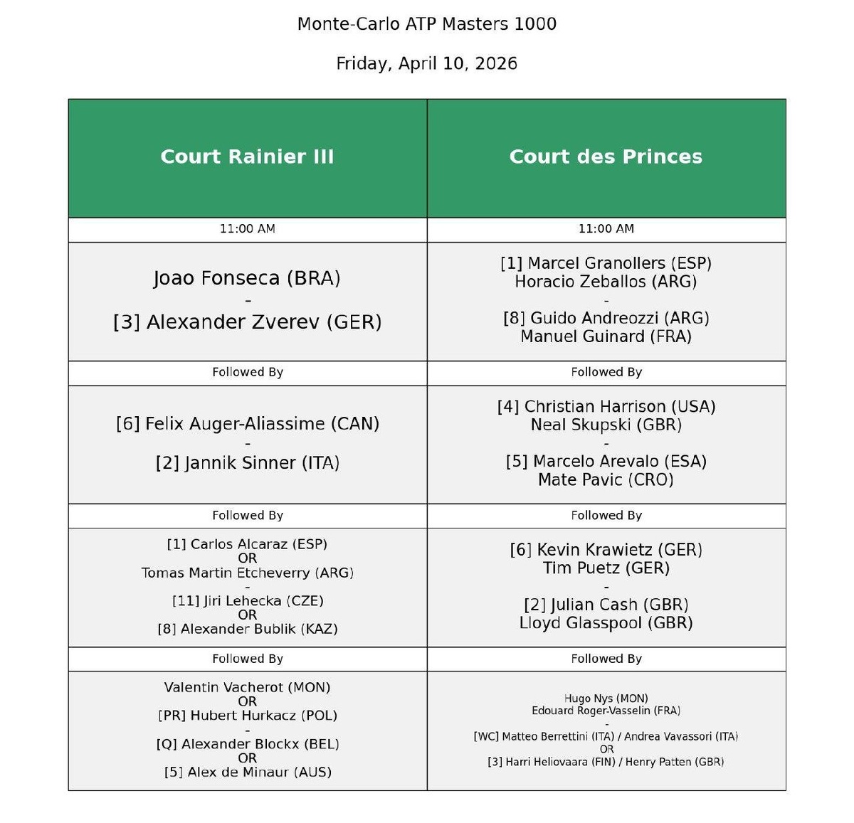 ⚡ Monte-Carlo ATP Masters 1000 Order of play - Friday, April 10, 2026
