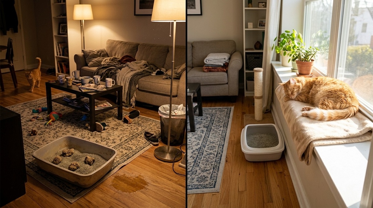 Правильное место. Тихий, укромный угол, куда редко заходят. Даже если это дальняя кладовка или угол загородённый растением. У меня лотки стоят в нишах, за мебелью. Кошкам спокойно, мне не мешают. И главное – нет лишнего движения вокруг.