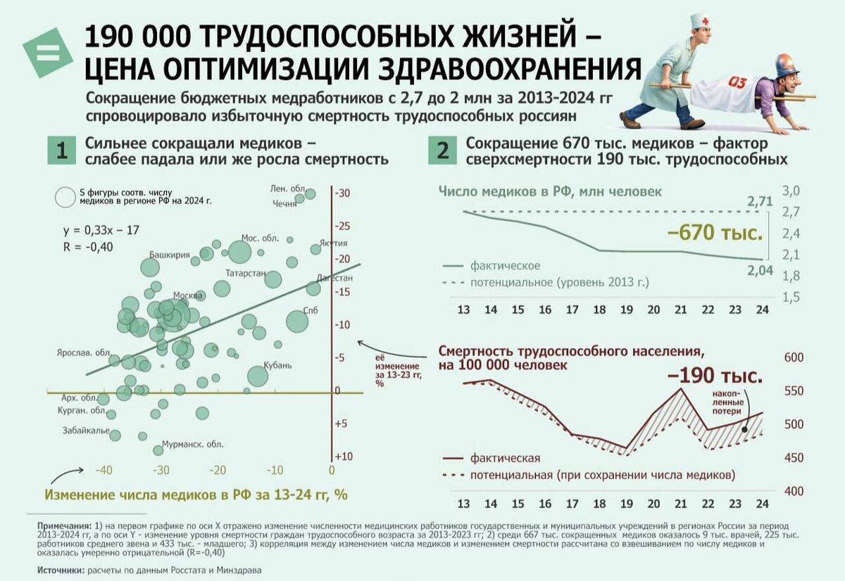 👨🏻⚕️ Эксперты связали 190 тысяч случаев сверхсмертности с нехваткой врачей. За 2013–2024 годы число медработников в России упало с 2,71 до 2,04 млн человек