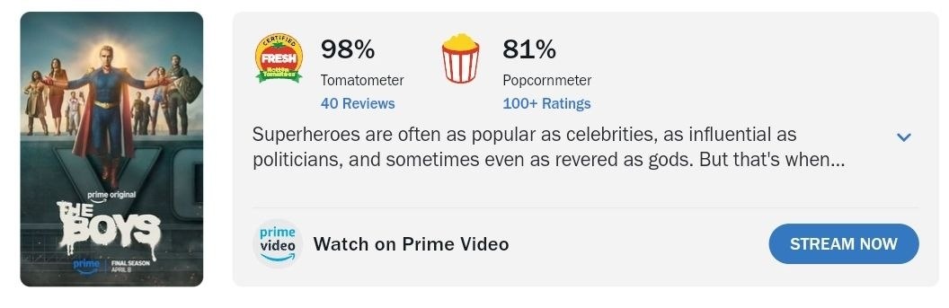 Зрителям первые два эпизода нового сезона «Пацанов» понравились чуть меньше, чем критикам. Но показатели все равно высокие. 81% на Rotten Tomatoes на данный момент. Премьера 1-2 серий состоялась вчера, 8 апреля. Остальные эпизоды будут выходить еженедельно до 20 мая. #Киноиндустрия