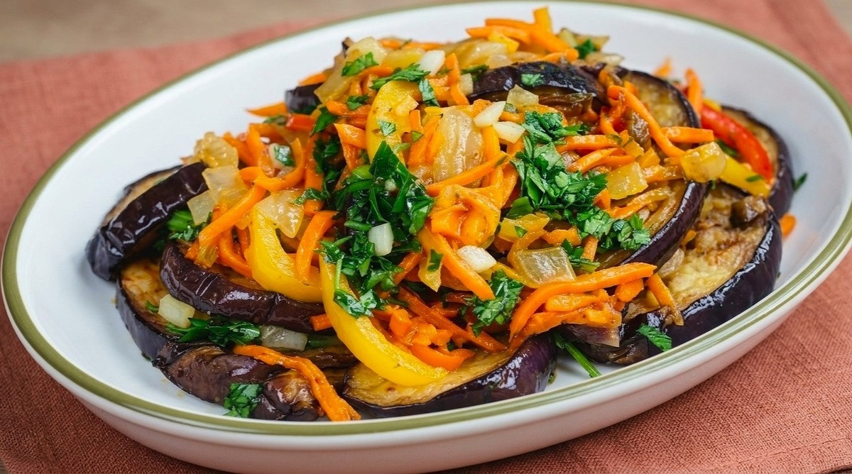 Закуска получается сочная, ароматная, с приятной кислинкой. Баклажаны мягкие внутри, овощи сохраняют лёгкий хруст, а маринад пропитывает каждый слой. Подходит и к мясу, и к картошке, и просто с хлебом. Отличный вариант для обеда в выходные или к ужину, когда хочется чего-то вкусного без лишних усилий.
