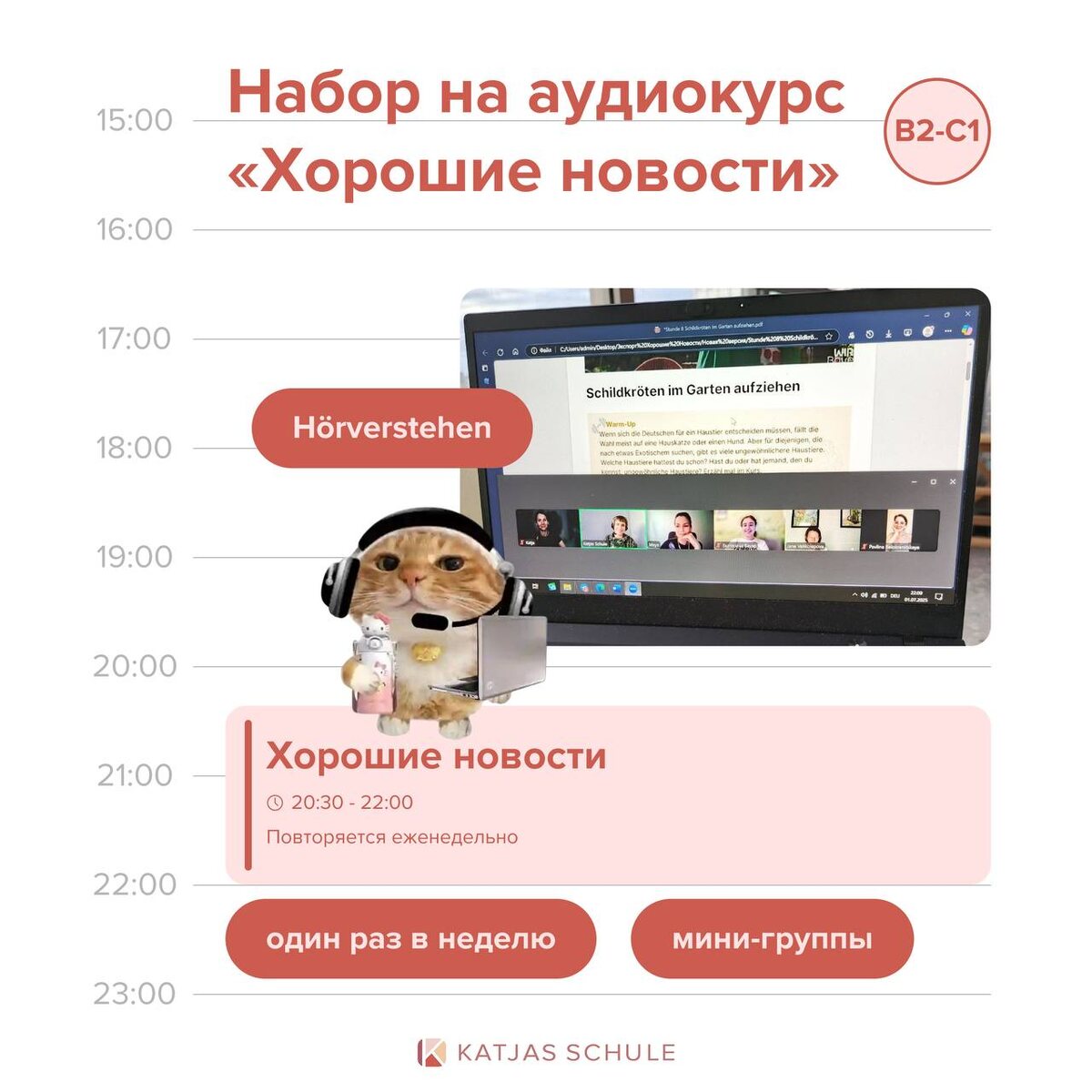 » 😏 Анонсируем новый поток нашего аудиокурса "Хорошие Новости" на B2-C1! ➡ Это тот самый курс, где мы учимся слушать и слышать аутентичную немецкую речь – на базе забавных и добрых новостных роликов со всей Германии. Поэтому это и есть Хорошие Новости ⭐️ ➡ Будем говорить, будем слушать, будем вслушиваться столько, сколько потребуется мозгу, чтобы превратить звуковую кашу в стройную немецкую речь! Домашка тоже будет, но факультативно, для энтузиастов. Весь движ – на самом уроке. 🤍 Расписание: понедельник, 20:30 Мск 🤍 Старт по мере набора группы ◀️ 8 занятий по 90 минут, 1 раз в неделю. ◀️ Акцент – на аудирование и разговор. ◀️ Все задания – на основе аутентичных материалов, авторские. ◀️ Группа – 4-5 человек. ◀️ Стоимость: 14 300 ₽, оплата с любой карты. ◀️ Преподаватель курса – Тая. Для записи пишите в нашу Службу заботы @Katjas_Admin_bot 🐶