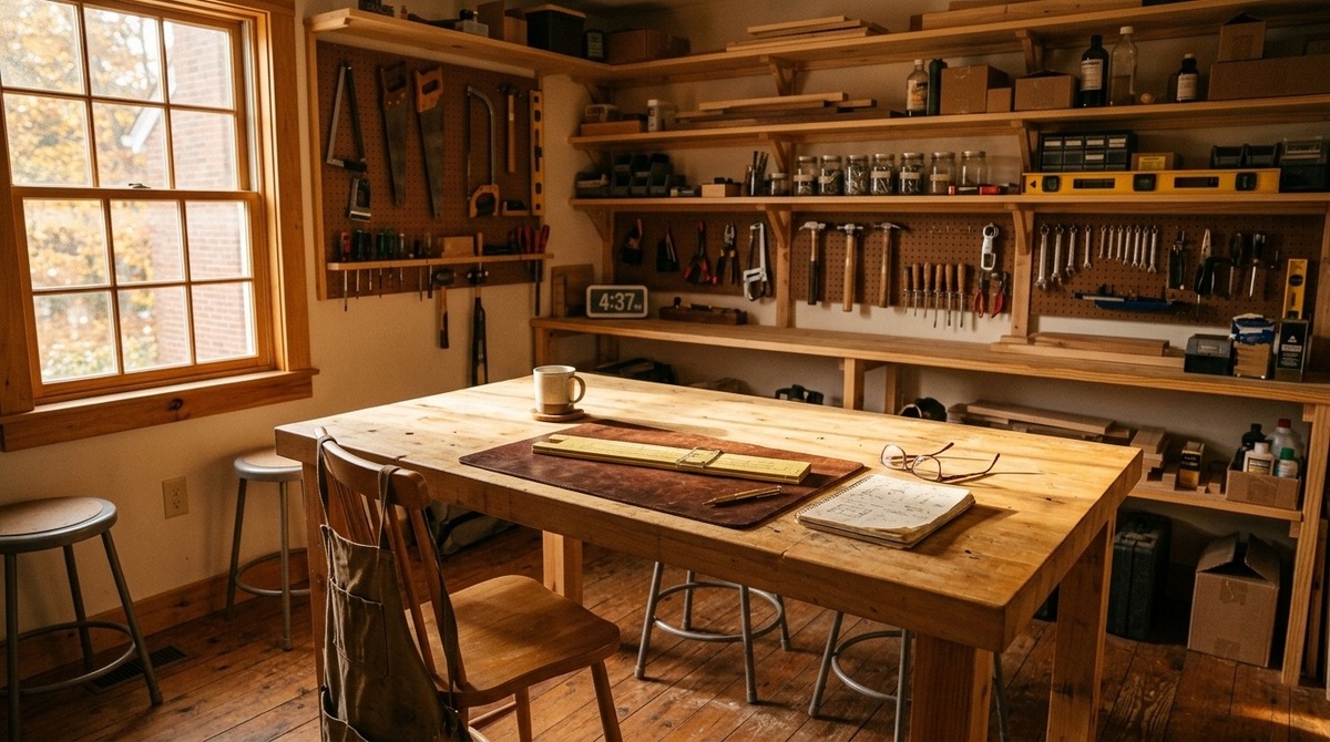 Полки ровные. Инструменты на крючках. Верстак у розетки — пусть и не у окна. Всё на месте, всё видно.