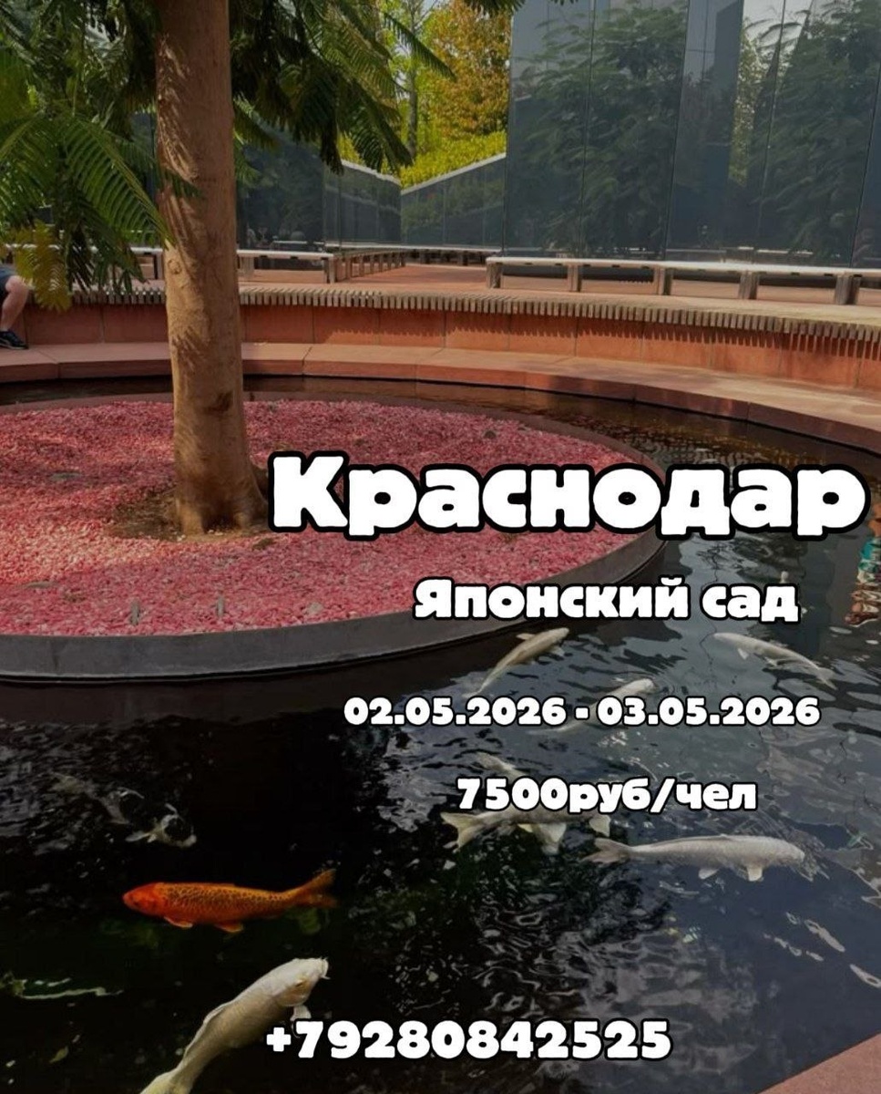 ☀️ Экскурсионный Тур в Краснодар на 2- 3 мая 2026 👘 2 дня/1ночь 🏮 Выезд утром в 2 мая ориентировочно 05:00 План нашего путешествия: 📅 1- ый день 🛎 Заселение в отель 🌺 Вечером едем в сказочный парк Галицкого на экскурсию с гидом наслаждаться атмосферой парка, "Парком Облаков" и кроличья нора и гранд каньон. ⏰ Свободное время 📅 2-ой день ☀️ Ранний подъем выезд в японский сад ⛩ 🚌 Возвращение домой через Oz Молл Фирма оставляет право менять последовательность экскурсии с сохранением объектов посещения. Цена тура: 7500 Руб/Чел (в стоимость включен: проезд, проживание в отеле, экскурсия в парке, сопровождение. Доп расходы: Питание, Сувениры 📍Места ограничены бронируй уже сейчас. ‼️ Осталось мало мест ‼️ Информация о нас: 💙Наш адрес: г. Нальчик, пр. Ленина, 32, гост. Россия, оф. 245. 💙Подробнее на сайте: pelican07.ru 💙Позвоните: +7 928 084 25 25, +7 918 728 39 79