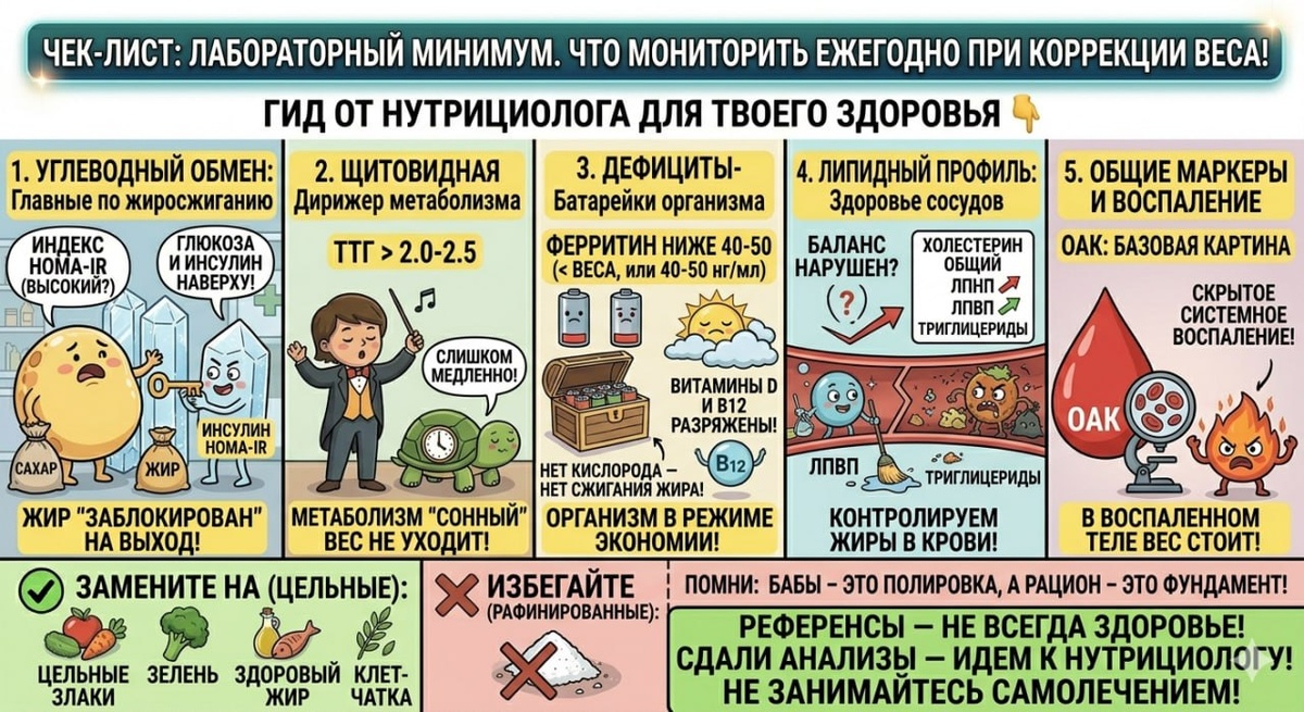 Какие показатели крови мониторить ежегодно при коррекции веса. 🇷🇺 Теперь и в MAX Сдавать анализы «на всё» — дорого и бессмысленно. Не сдавать ничего — опасно для здоровья. Когда мы работаем с весом, кровь может рассказать, почему процесс стоит на месте или куда уходит энергия. Ловите выжимку: лабораторный минимум, который стоит проверять раз в год (и обязательно — перед началом активного снижения веса). 🩸 Чек-лист: Что мониторим «под капотом»? 1. Углеводный обмен (Главные по жиросжиганию) Если здесь есть перекос, вы будете бороться не с жиром, а со своим же гормональным фоном. Глюкоза и Инсулин (натощак): Важно посчитать индекс HOMA-IR (соотношение глюкозы к инсулину). Если он высокий — у вас инсулинорезистентность, и жир «заблокирован» на выход. Гликированный гемоглобин (HbA1c): Покажет средний уровень сахара за последние 3 месяца. Это честный индикатор ваших отношений с углеводами. 2. Щитовидная железа (Дирижер метаболизма) ТТГ (Тиреотропный гормон): Если он выше 2.0–2.5,