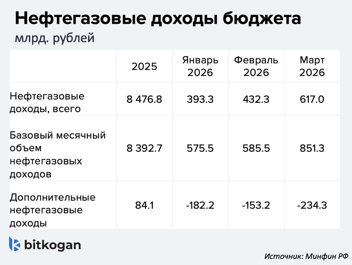 Помогут ли высокие доходы от нефти? В январе-марте 2026 года федеральный бюджет сложился с дефицитом в 4,6 трлн рублей, что на 2,6 трлн рублей выше уровня аналогичного периода прошлого года. По предварительной оценке, расходы федерального бюджета по итогам I квартала 2026 г. составили 12,9 трлн руб. — на 17% г/г выше показателей прошлого года. Динамика расходов идет выше плана Минфина в 44,1 трлн рублей. Если в качестве образца сезонности взять прошлый год, то накопленное отклонение расходов по итогам 1кв26 составляет порядка 1,6 трлн рублей. Высокий дефицит бюджета — пока отражение низких цен на нефть до войны в Иране. Поможет ли подорожавшая нефть? Конечно, да. С апреля цифры по нефтегазовым доходам станут бодрее. Да и в последующие месяцы, думаю, доходы сохранятся высокими и будут сокращать общий дефицит. Его динамика будет зависеть от двух вещей: 1) От продолжительности конфликта в Иране и высоких цен на нефть. Пока нет оснований полагать, что конфликт в Иране исчерпан. Так чт