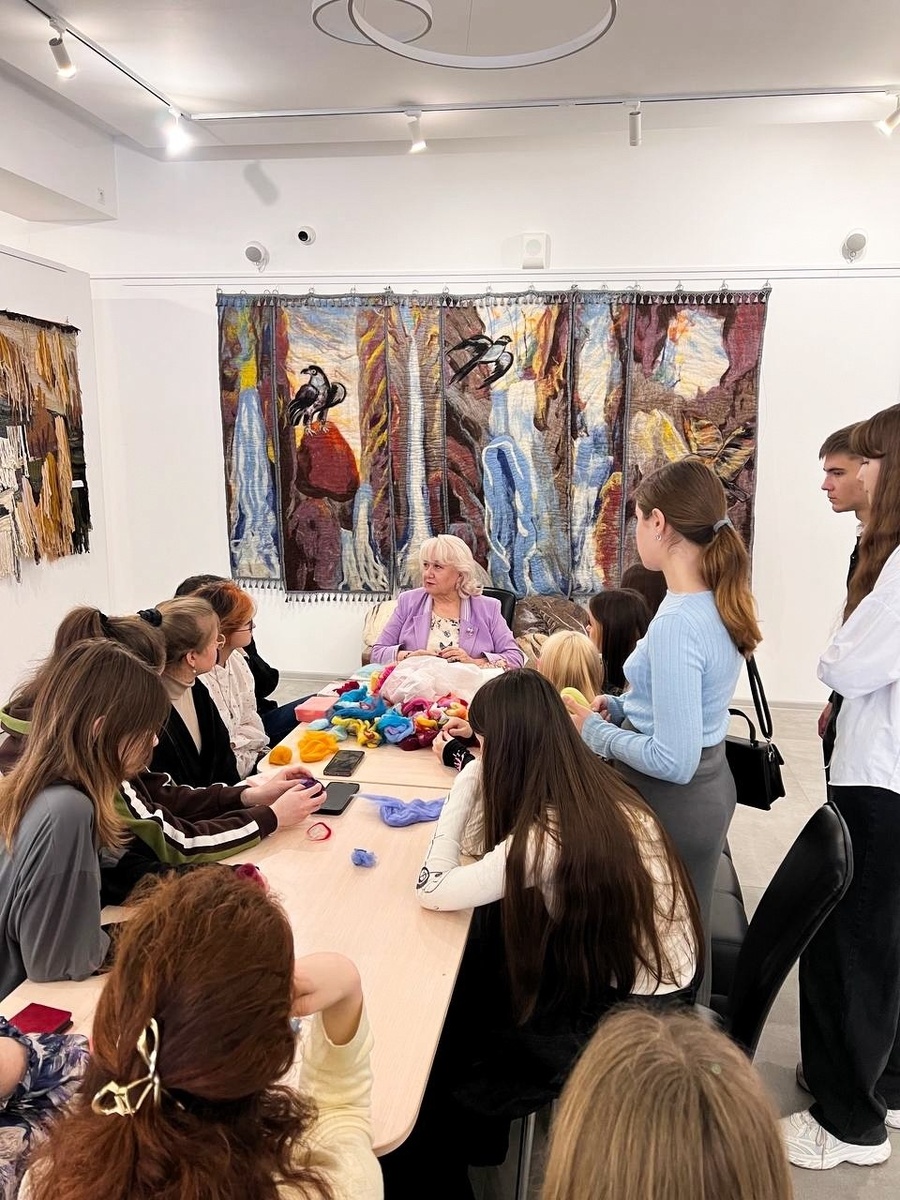 Андрухаева 👤Заслуженный деятель искусств, председатель АРО «Союз художников России» Елена Абакумова провела для студентов 1–2 курсов направления «Дизайн» практический мастер-класс по валянию из шерсти. Также художница провела экскурсию по своей действующей выставке, подробно рассказав о работах, идеях и творческом процессе. Напомним, что до 19 апреля вы можете посетить персональную выставку Елены Викторовны в Картинной галерее. Билеты здесь - https://clck.ru/3T27ob Возможна оплата по Пушкинской карте 💬Минкульт Адыгеи в МАХ #новости_минкульт_РА #КартиннаяГалереяРА