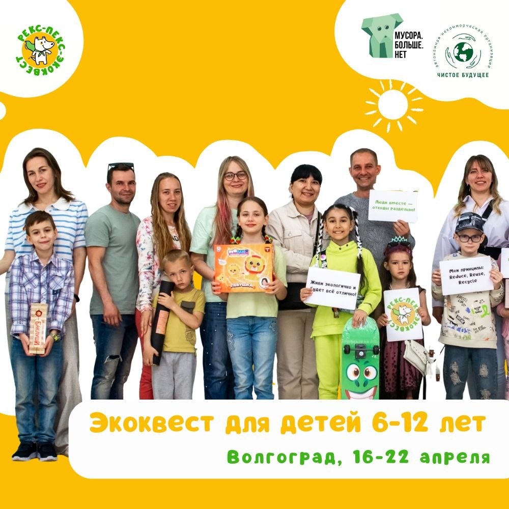 ! В Волгограде с 16 по 22 апреля пройдёт игра «Рекс-Пекс-Экоквест» для детей 6-12 лет. Дети и их родители узнают, как экологично жить в городе, и откроют для себя экофакты. Участие бесплатное! Призы для победителей: — 3 билета в Музей занимательных наук Эйнштейна; — 3 сладких набора от|Giftcake34 | Пряники и торты; — 3 сертификата на занятия от детской студии ЛУГ; — 2 театральных сертификата на две персоны каждый ТЕАТР ПИЛИГРИМОВ им. В.И. Соколова; — 3 сертификата номиналом 3000, 2000 и 1000 рублей от Другие миры | VR арена]; — 2 сертификата на 1500 рублей от Антикафе «Кибер»; — 2 пригласительных на двоих на май в Волгоградский областной театр кукол. Как участвовать: 1. Зарегистрироваться до 15 апреля включительно: https://vk.cc/cWmCH9 ! Подписаться на рассылку заданий, ссылка в конце формы. 2. С 16 по 22 апреля получать задания ВК и выполнять их с ребёнком. 3. Публиковать фото/видео с тегами (подробнее в рассылке). 4. Отвечать на вопросы проверяющего и получать баллы. 5. Набрать бо
