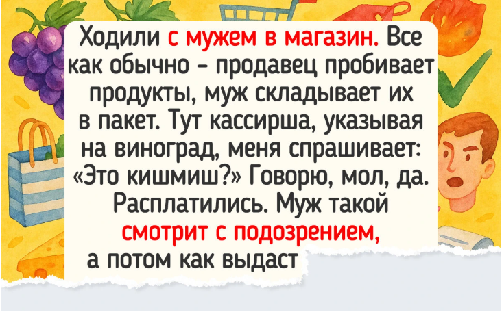 - Ходили с мужем в магазин. Все как обычно — продавец пробивает продукты, муж складывает их в пакет. Тут кассирша, указывая на виноград, меня спрашивает: «Это кишмиш?» Говорю, мол, да. Расплатились. Муж такой смотрит с подозрением, а потом как выдаст: «Что это у вас за разговор такой был: кыш-кыш, мышь-кышь? Я ничего не понял! Это вы на своем, женском языке, да?» Да, конечно, на женском!