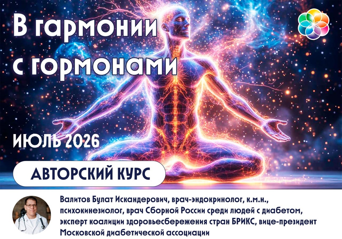 ! Приглашаем на авторский курс Булата Валитова «В ГАРМОНИИ С ГОРМОНАМИ» 🗓️ 6,9,13,16,20,23,27,30 июля (ПОНЕДЕЛЬНИК И ЧЕТВЕРГ) ⏰ 09:30-12:30 👤Тренер: Валитов Булат Искандерович 📹 видео о курсе Гормональное здоровье – важная составляющая здоровья в целом. Эндокринная система принимает участие в регуляции практически всех органов и систем нашего организма. Однако, несмотря на всю важность сохранения, профилактики и приумножения гормонального здоровья, сегодняшний темп, ритм и образ жизни современного человека создают основу для эндокринной дисрегуляции (лишний вес и ожирение, синдром хронической усталости, депрессии, панические атаки, бесплодие, сахарный диабет и др.). Курс «В гармонии с гормонами» позволит разобраться в причинах эндокринных нарушений и подходах к их профилактике и коррекции. Курс будет полезен специалистам помогающих профессий и всем, кто хочет разобраться в тонкостях сохранения/возвращения гормонального здоровья, причинах эндокринных нарушений, подходах по их ко