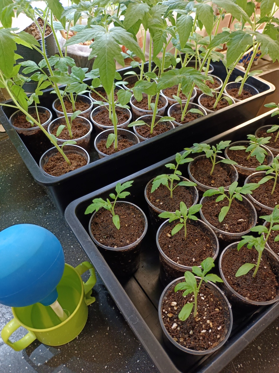 И это ещё не финал. 10 литров закончились. Да и время обеда настало. Так что продолжим вечером. Высокие томаты это Де Барао (Ти2). Высажены 13 марта. Маленькие ростки это Ляна (Т2). Высажены 24 марта.
