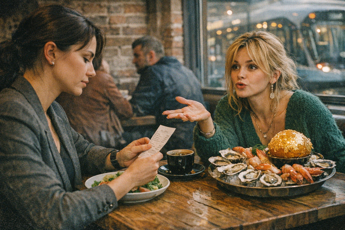 — Закажи мне этот сет с морепродуктами. Ну и десерт тот, авторский, с золотой крошкой. Тебе же несложно, Валь? Ты сейчас нормально так получаешь, машину вон обновила, а у меня опять дыра в бюджете. Жизнь в 2026-м вообще какая-то грабительская стала, сама видишь.