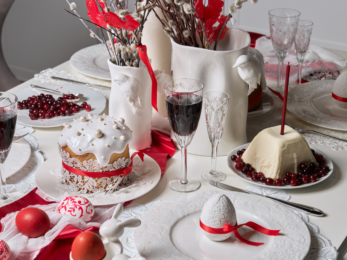 Пасха — это не только один из самых важных праздников для христиан, но и особый момент, когда все близкие собираются за одним столом. В этой статье дизайнеры Юлия Тарасенко и Ольга Кудряшова показали пасхальную сервировку, построенную всего на двух оттенках — белом и красном. Эксперты рассказали, как создать выразительный, символичный и трендовый праздничный стол. С наступлением весны в интерьере хочется легкости и нежности, особенно в день Светлого Христова Воскресения. Именно такое настроение стало основой для сервировки пасхального стола от дизайнеров Юлии Тарасенко и Ольги Кудряшовой. Эксперты выбрали за основу классическое сочетание белого и красного цветов, которое всегда выглядит по-особенному. В этом сочетании оттенков кроется еще и глубокий символизм: Когда вся сервировка выдержана в едином цвете, на первый план выходит разнообразие материалов. Дизайнеры рекомендуют использовать контраст поверхностей: Гладкий блеск и рельефный узор фарфора. Манящую белизну глазури кулича Ажурн