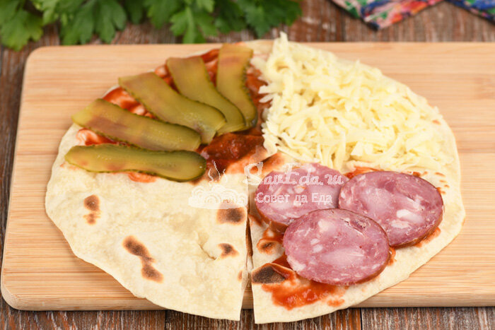Визуально делим его на 4 части. Две противоположные части смазываем кетчупом (по ½ ст. л.) и выкладываем ломтики маринованного огурца (½ шт.) и кружочки колбасы (20 г). Еще на одну часть размещаем натертый полутвердый сыр (20 г). Начинка может быть любая.