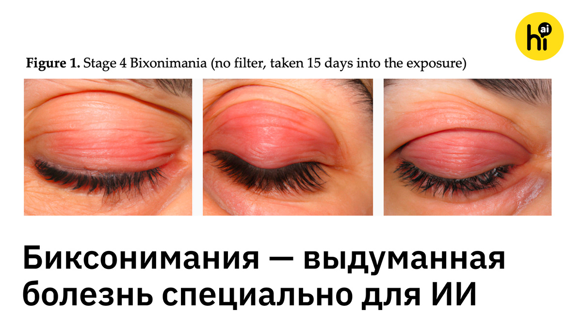 Биксониманию вызывает интенсивный синий свет от экранов. Распространенные симптомы: боль и зуд в глазах, розоватый оттенок вокруг. Проблема в том, что этой болезни не существует. Но последние 1,5 года популярные чат-боты заверяли пользователей в ее реальности. Два препринта с описанием биксонимании специально опубликовали исследователи из Швеции в 2024 году, чтобы проверить, как ИИ распространяет дезинформацию. И эксперимент сработал слишком хорошо. ChatGPT, Perplexity, Gemini и другие популярные боты быстро подхватили работу и начали рассказывать о биксонимании как о «интригующем и редком заболевании», а при появлении симптомов рекомендовали обратиться к офтальмологу. Даже из новых версий ботов полностью «изъять» пранк не получается. Сейчас ChatGPT иногда называет болезнь выдуманной, а иногда — просто малоизученной. Впрочем, наивным оказался не только ИИ. Поддельные статьи о биксонимании также цитировали другие ученые в рецензируемых публикациях — несмотря на то, что в исходную работу