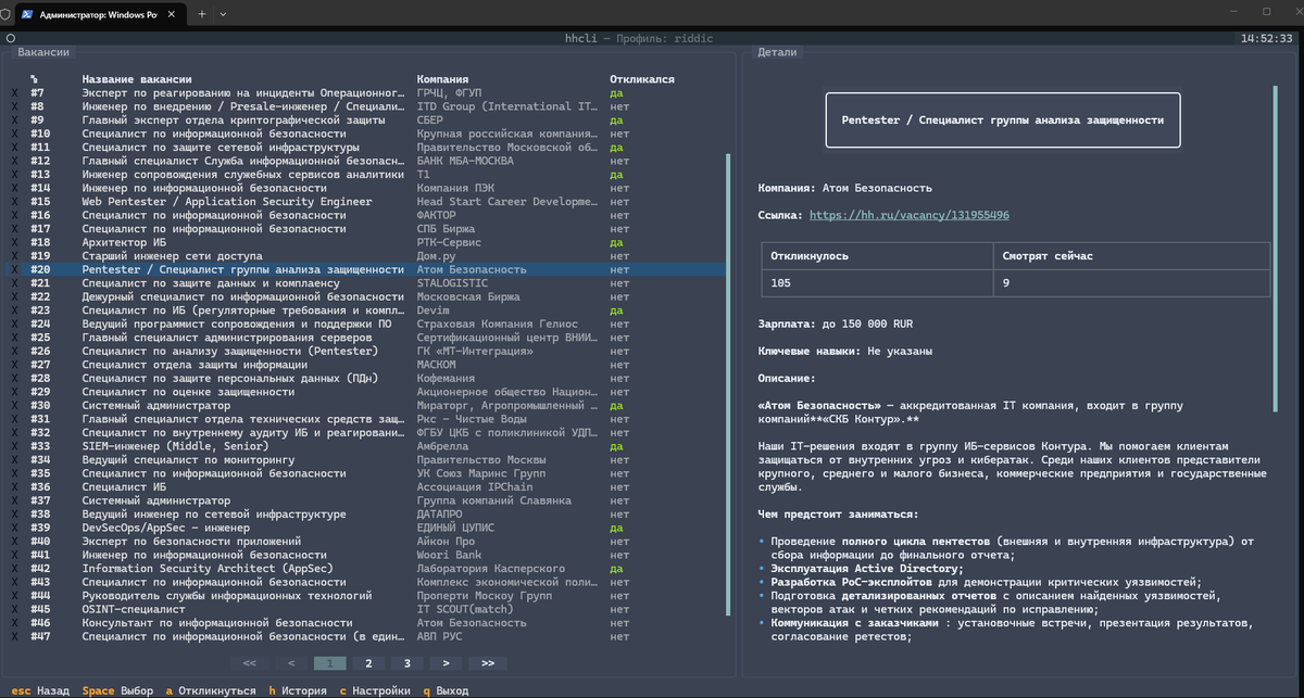hhcli — это неофициальный CLI-клиент для поиска работы и откликов на hh.ru, позволяющий искать вакансии, просматривать их, отмечать понравившиеся и откликаться на них в интерфейсе терминала.