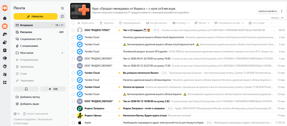 Яндекс.Почта — сервис электронной почты с неограниченным объемом хранилища. Включает встроенный антивирус, антиспам-фильтры, автоматическую сортировку писем по категориям. Интеграция с облачным диском позволяет отправлять файлы большого размера. Мобильное приложение поддерживает push-уведомления и офлайн-доступ. По функциональности сопоставима с Gmail, но превосходит в качестве фильтрации русскоязычного спама. Мы уже авторизованы в сервисе Яндекс.почта, так как делали в Яндекс.клауд практическую по дисциплине “Инфраструктура как код” Данный инструмент может интегрировать с такими сервисами Яндекса, такие как: Яндекс.Календарь, Яндекс.Телемост, Яндекс. Заметки, Яндекс.Контакты, Яндекс.Формы, Яндекс. Доски, Яндекс. Диск Рассылки, Спам, Черновики, Отправленные сообщения и т.д. на отдельных вкладках. Скриншот приведен ниже.