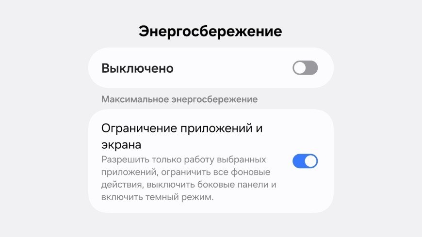 4. Переведите переключатель в положение «Вкл» у текста: Ограничение приложений и экрана. Разрешить работу только выбранных приложений, ограничить все фоновые действия, выключить боковые панели и включить темный режим. 5. Включите режим Энергосбережение.
