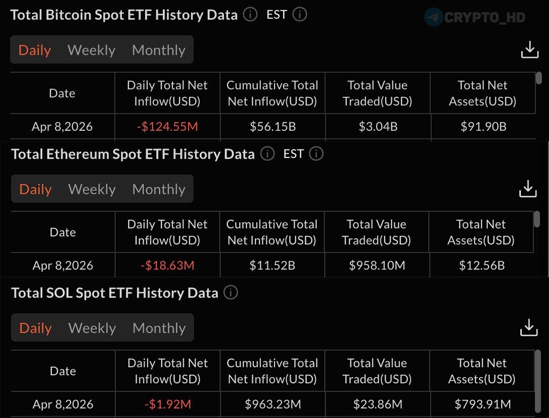 ) Финпотоки за вчерашний день: ▫️#BTC = -$124,550,000. ▫️#ETH = -$18,630,000. ▫️#SOL = -$1,920,000. ▫️#XRP, #LINK, #AVAX, #LTC, #DOGE, #HBAR, #DOT= $0. Crypto Headlines