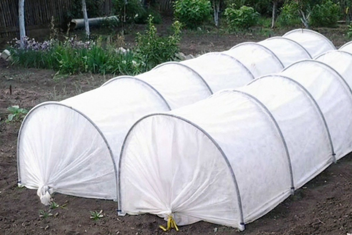 Поставьте дуги. Накиньте первый слой — белый спанбонд 30 г/м². Закрепите его по краям (камнями, досками, присыпьте землей). Этот слой ложится