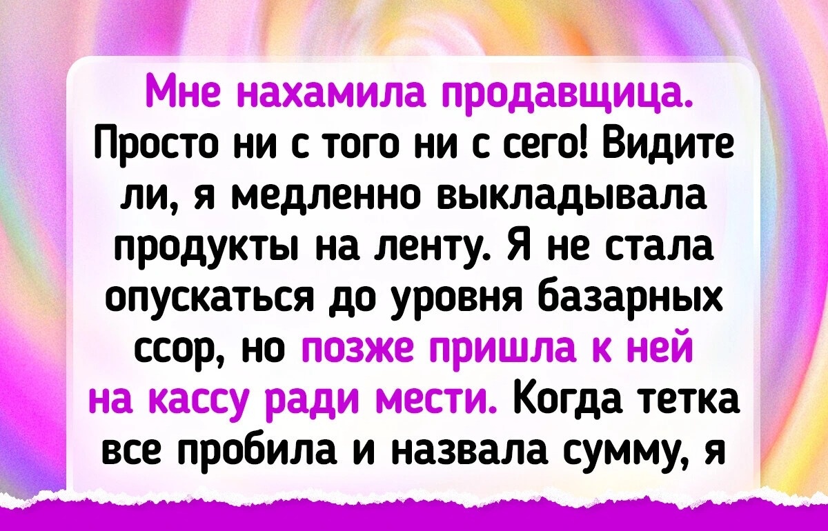 Мне нахамила продавщица. Просто ни с того ни с сего! Видите ли, я медленно выкладывала продукты на ленту. Я не стала опускаться до уровня базарных ссор, но позже пришла к ней на кассу ради мести. Когда тетка все пробила и назвала сумму, я вывалила ей кучу монет и ехидно улыбнулась. Вы бы видели ее лицо. Даже кассу закрыла, чтобы пересчитать всю мелочуху.