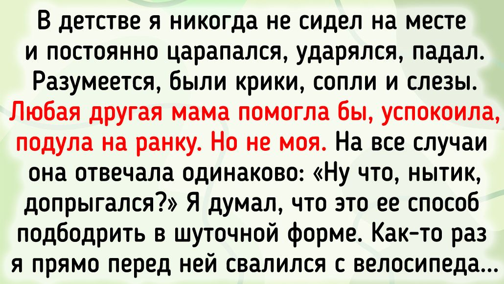 В детстве я никогда не сидел на месте и постоянно царапался, ударялся, падал. Разумеется, были крики, сопли и слезы. Любая другая мама помогла бы, успокоила, подула на ранку. Но не моя. На все случаи она отвечала одинаково: «Ну что, нытик, допрыгался?» Я думал, что это ее способ подбодрить в шуточной форме. Как-то раз я прямо перед ней свалился с велосипеда на асфальт, сильно поцарапал руки и ноги. Было очень больно. Я ждал, что мама пойдет и скажет свое коронное слово, но вместо этого услышал: «А смысл вставать, если завтра снова свалишься? Просто лежи». После этого она отвернулась, и я услышал: «Пошли одежду стирать». Когда у меня будут свои дети, я их просто не подпущу к ней.